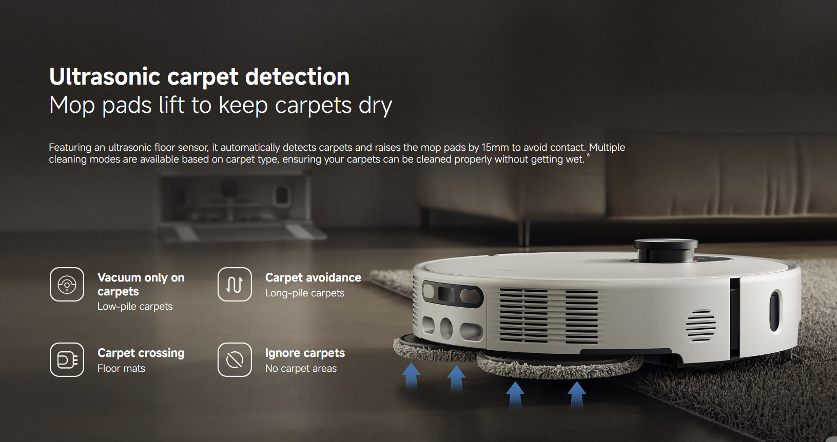 - قابلیت عبور از موانع و تشخیص عرض کم فضا: امکان نظافت زیر مبلمان با ارتفاع کم (مثلاً ۹٫۵ سانتیمتر) اعلام شده است.