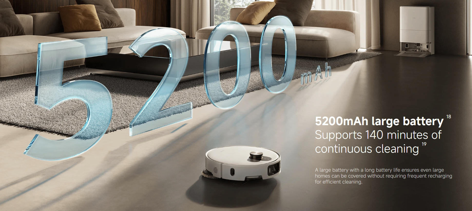 - باتری با ظرفیت قابل توجه: برای این سری ذکر شده تا حدود ۵٬۲۰۰ میلیآمپرساعت (mAh) که حدوداً تا ۱۴۰ دقیقه زمان نظافت دارد.